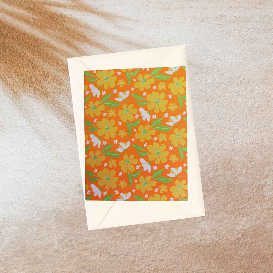 An orange card with yellow and white flowers.