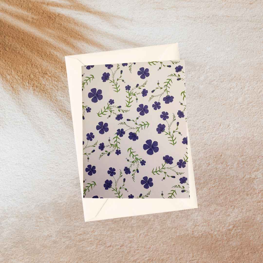 Een witte kaart met paarse bloemen er op.