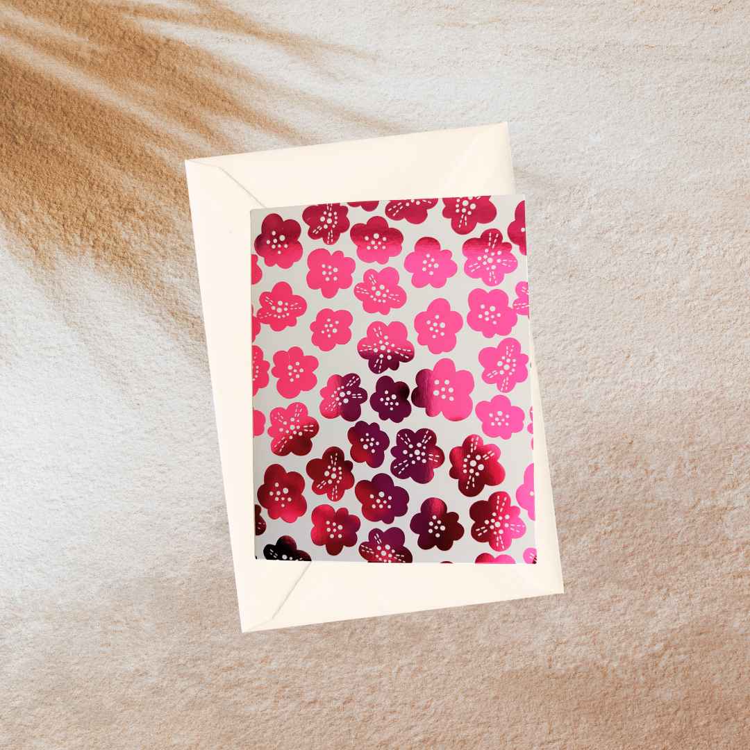 Een witte kaart met roze bloemen.